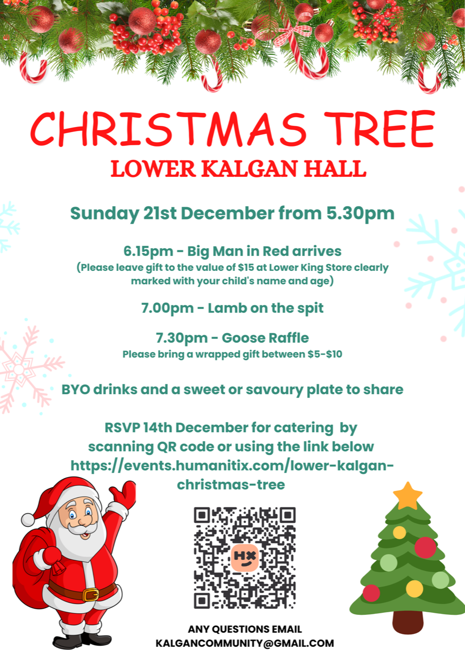 Lower Kalgan Christmas Tree Sunday 21 December 2025 5:30 pm 8:30 pm Lower Kalgan Hall (map) Google Calendar ICS